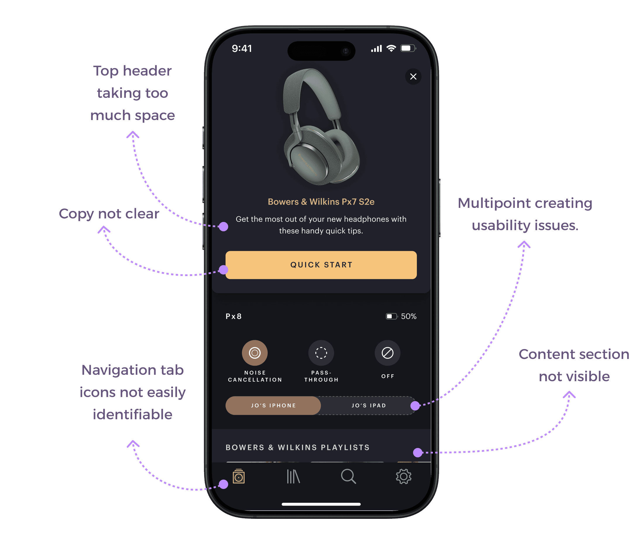 Placing controls directly on the main page led to user confusion and a cluttered appearance. Therefore, only the main controls were prioritised and displayed. From analytics data it was observed that ANC setting is the most interacted setting on this page.